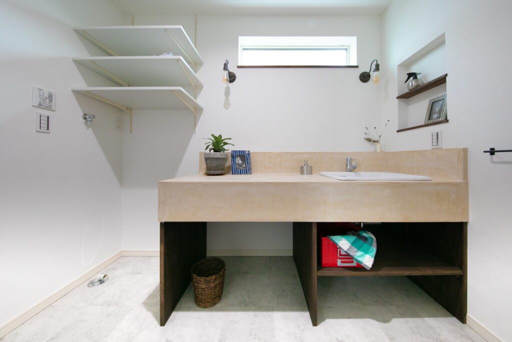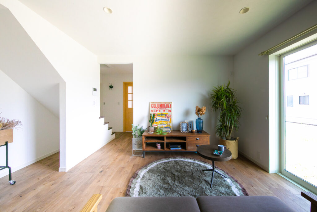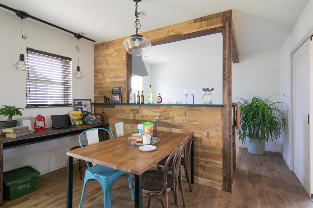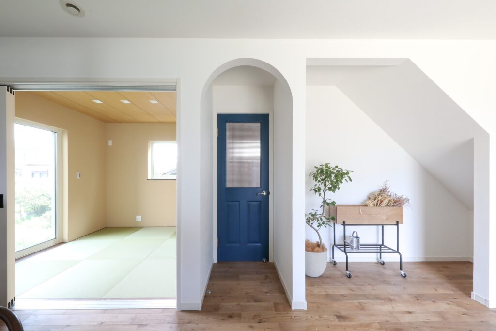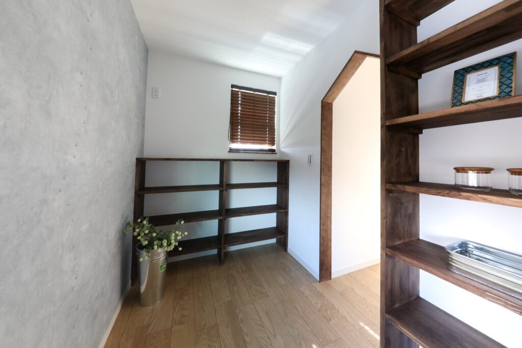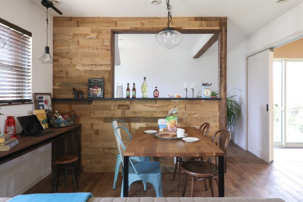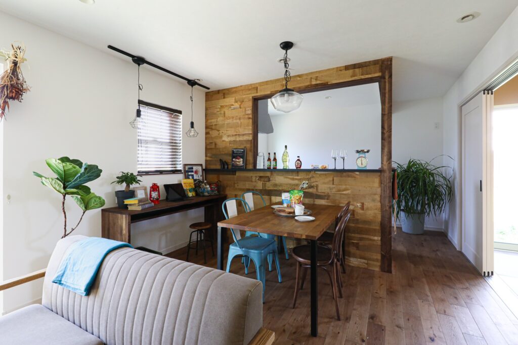 その他にも造作カウンターを古材張で仕上げたカフェ風キッチン、そのすぐ隣に設けた和室、奥様の趣味スペース、階段下を利用したピアノスペースなど家で過ごす時間が長いご夫婦らしい間取りになっています。