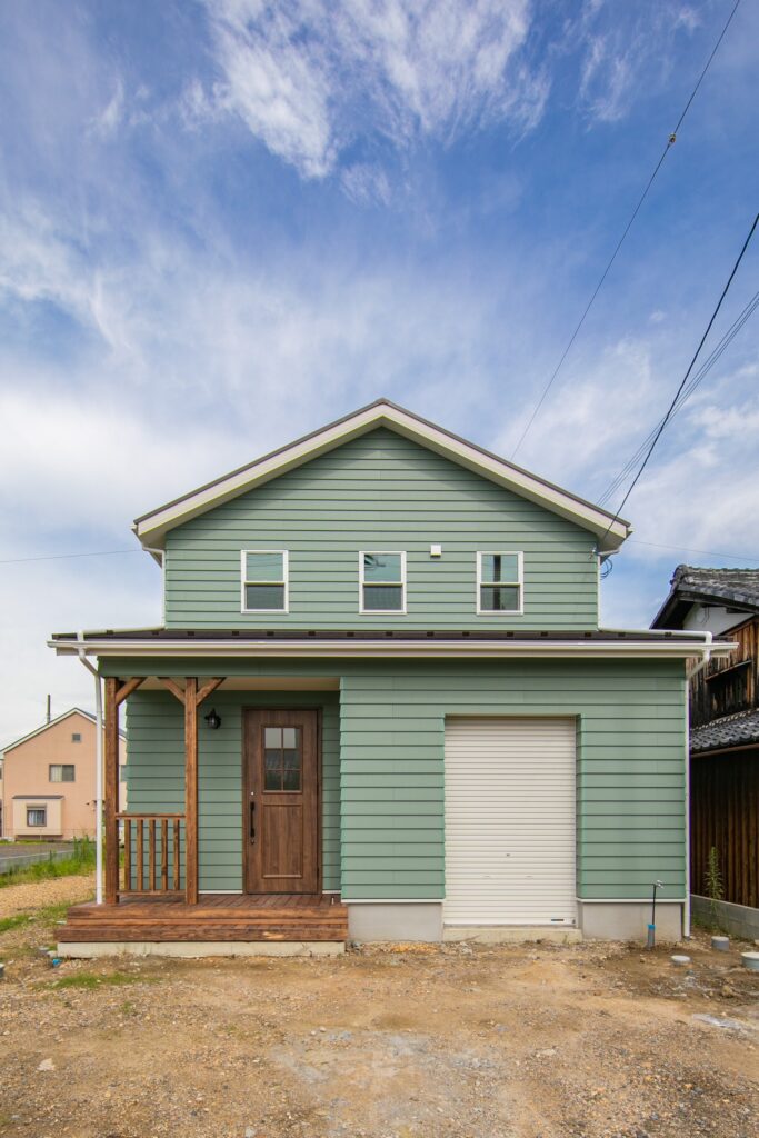優しいグリーンの外壁のガレージ付きハウス
