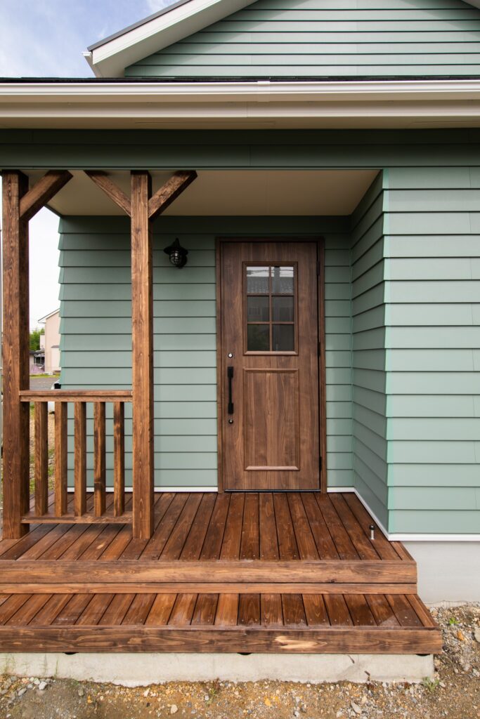 旧街道沿いに建つ優しいグリーンのラップサイディングの外壁とダークカラーのウッドデッキが目を惹くお家です。